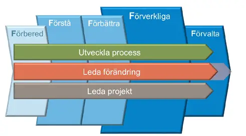Modellen delar in projektet i fem faser och arbetet i tre dimensioner (projektledning, förändringsledning och processutvecklingsmetodik):